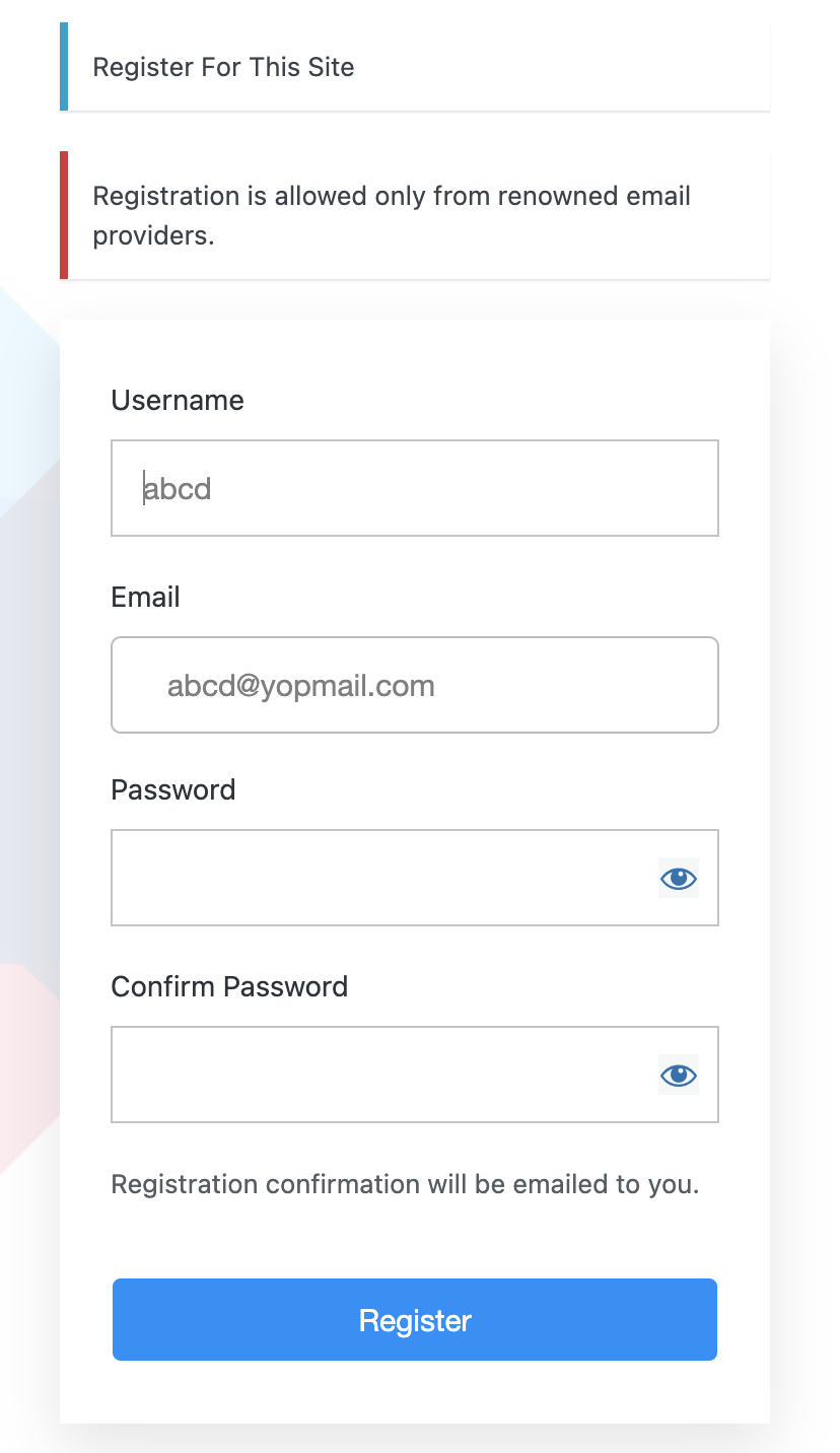 Now if anybody tries to login from Dummy Email providers like yopmail.com. It will not let anyone login. If anybody tries with abc@gmail.com even if the account will not activated because a confirmation email it sent to provided email address to activate the account. So this is how I prepped a new defence to protect my website by getting rid of dummy registration for time being.